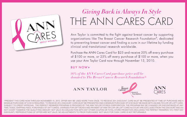 Ann Taylor offers the Ann Cares card where you can purchase it for $25 and get 20 to 25% off on your entire purcase of $100 or more. 90% off the card purchase will be donated to the Breast Cancer Research. You can donate and save money at the same time. It's a win-win situation. Visit anntaylor.com for more info